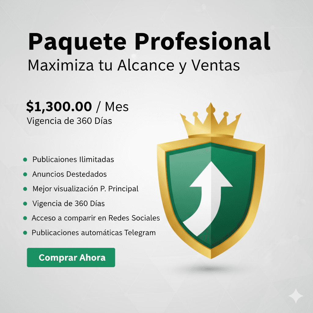 El Paquete Profesional es la solución definitiva para vendedores serios que buscan el máximo alcance y visibilidad en Ventus. Obtén publicaciones ilimitadas, destaca tus mejores anuncios y automatiza tu difusión en Telegram para asegurar que tu inventario llegue a miles de compradores todos los días.